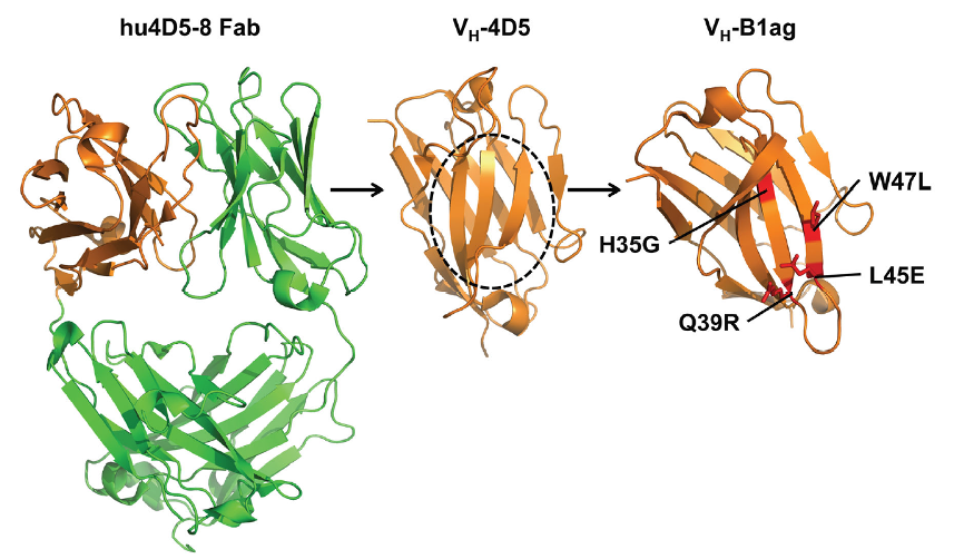 不同于VHH抗体,人抗体中重链和轻链需要配对才能维持稳定的结构,并且在抗体重链和轻链相互作用面上分布着一些疏水氨基酸以增强其相互作用。但是在人VH抗体中,因为没有轻链的相互作用,因此抗体更易聚集。目前已经有多种方案用于解决人VH抗体易于聚集的问题: