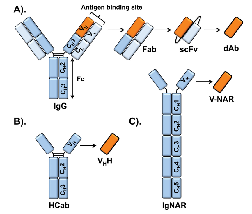 1993年,比利时布鲁塞尔自由大学免疫学家Hamers-Casterman教授以及他的同事们在骆驼的血清中发现了有别于传统抗体的新型抗体,这种新型抗体仅由两条重链构成,因此被称为重链抗体(Heavy-Chain Antibody, HCAb)。重链抗体利用重链的可变区结合抗原VHH(Variable Domain of Heavy Chain of Heavy-Chain Antibody),其分子量约为15kDa,大小仅为人类完整抗体的十分之一左右,因此被称为纳米抗体(Nanobody, Nb)。除了在骆驼科动物中发现HCAb外,后续的研究者在软骨鱼中也发现了仅含有重链的独特抗体IgNAR,但是在应用和研究中,目前绝大多数都集中在VHH方面,这是因为VHH与人类抗体的VH相比,其同源性较高,因此人源化比较简单。