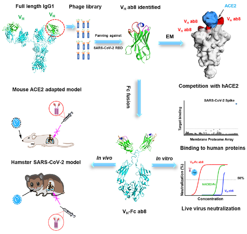 人VH抗体除了可以用于肿瘤药物的开发,还可以用于抗病毒药物开发,新冠疫情爆发后,来自于美国匹兹堡大学的Dimiter (Mitko) Dimitrov博士等研究学者就利用人VH噬菌体库筛选开发了首个靶向中和SARS-CoV-2冠状病毒的人VH抗体Ab8。该抗体不仅具有治疗COVID-19的潜力,而且还可能用于防止人们感染SARS-CoV-2,较小的分子量也使得其通过吸入等替代途径给药成为可能。