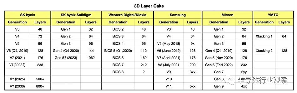 下表比较了 NAND 制造商的 3D NAND 分层状态、历史和计划: