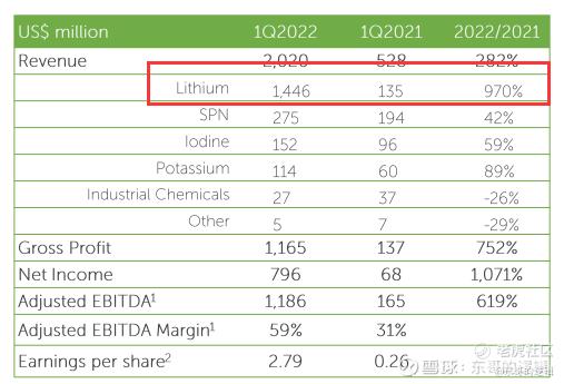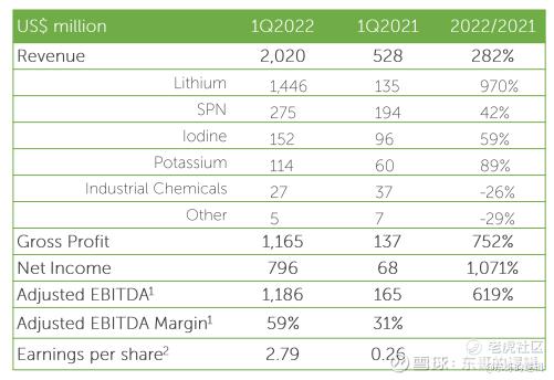 1、截至2022年Q1,SQM前3个月的净利润为7.961亿美元;2021年同期为0.68亿美元,大幅增加1071%!
