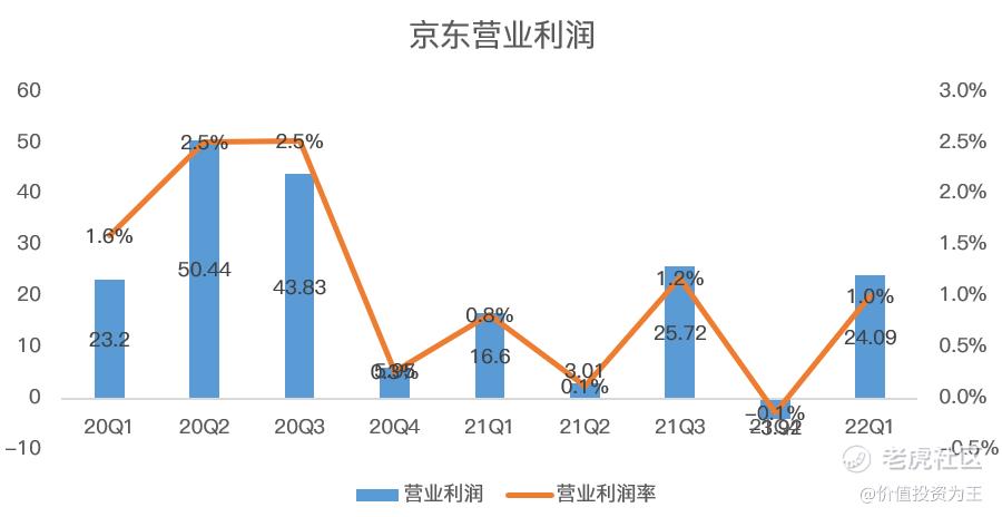 一季度,京东营业利润24亿,同比增长45%,营业利润率由0.8%提升至1%: