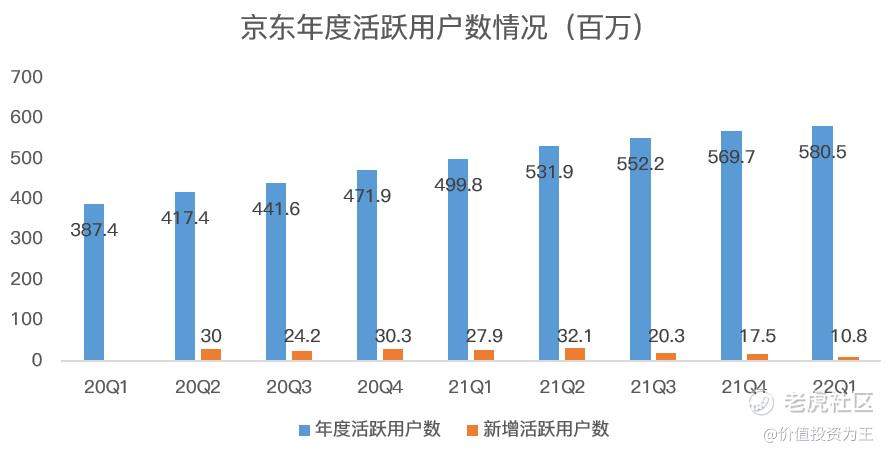 聊完收入,再看用户端,今年一季度,京东年度活跃用户数达到5.805亿,同比新增活跃用户数1080万。