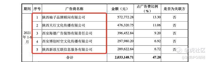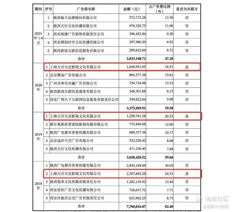 冰峰饮料招股书(申报稿)显示,2021年1-6月前五大广告商金额为2,033,148.71元、占比47.20%。分别为陕西柚子品牌顾问有限公司(以下简称“陕西柚子”)交易金额572,772.28元、占比13.30%,陕西天行文化传播有限公司(以下简称“陕西天行”)交易金额476,320.75元、占比11.06%,西安海德广告装饰有限责任公司(以下简称“西安海德”)交易金额396,452.84元、占比9.20%,西安博创时空文化传播有限公司(以下简称“西安博创”)交易金额297,980.20元、占比6.92%,陕西新浪互联信息服务有限公司(以下简称“陕西新浪”)交易金额289,622.64元、占比6.72%。2018年、2019年、2020年第二大和连续两年第一大广告供应商上海万合天宜影视文化有限公司从2021年1-6月名单“消失”。