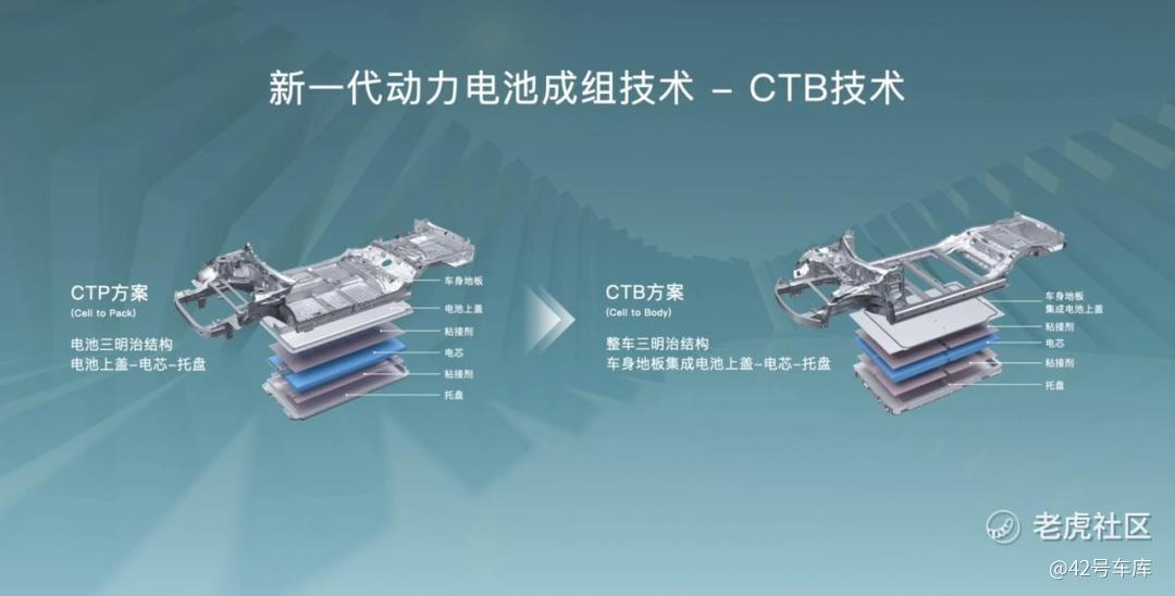 CTB 即「Cell To Body」,和之前大家听闻过的「CTC」技术属于同类,对比此前 CTP 无模组设计的电池包,新结构最大的不一样在于电池系统的设计集成度更高,电池包如今直接成为了底盘上的结构件,整车的力学性能更好,同时底盘的 Z 向厚度更薄。