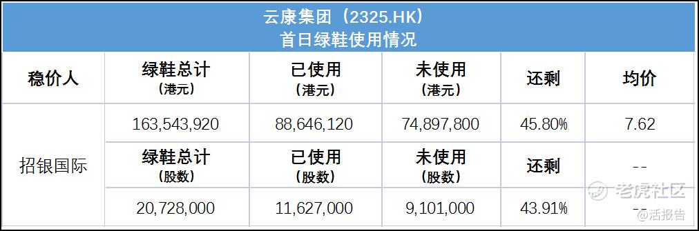 云康集团首日收涨,全靠招银绿鞋支撑股价,绿鞋已经使用8800万港元(1162万股),还剩7500万港元(约910万股)。