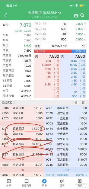 二、首日盘中,云康一度跌近17%,后V型反转,根据全盘数据显示,稳价人招银在其买方有挂较大的委托单撑住股价;