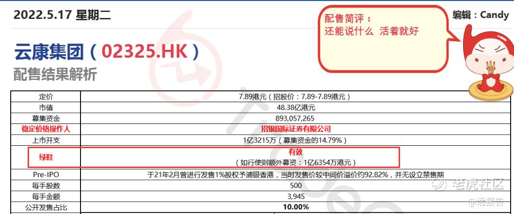 一、根据捷利交易宝配售结果解析,云康集团(02325.HK)绿鞋有效,绿鞋金额约1亿6300万(股数:2亿股),稳价人为招银国际。