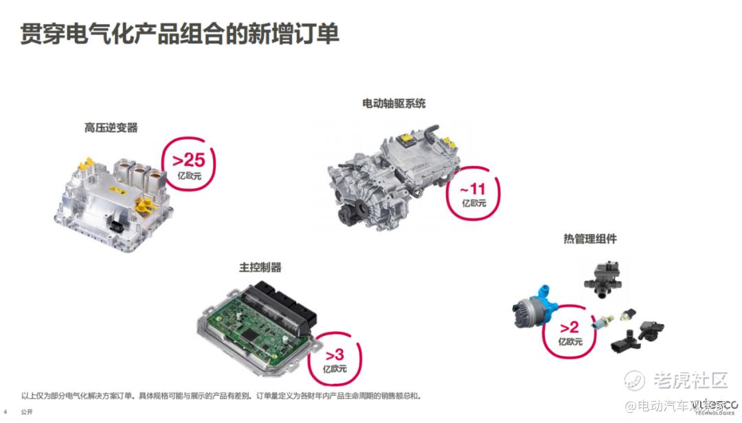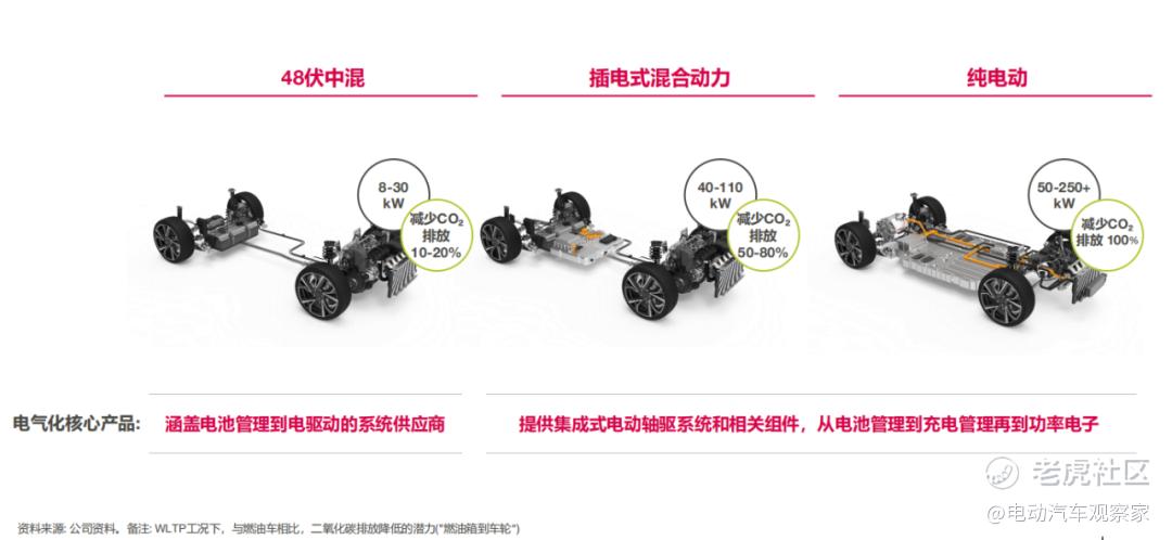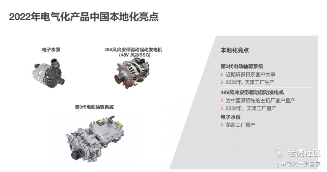因此,他们具备完整的电气化方案,核心产品涵盖了48V系统、插电式混合动力和纯电动的电驱动、电池管理系统、充电系统,热管理系统、以及功率电子领域。