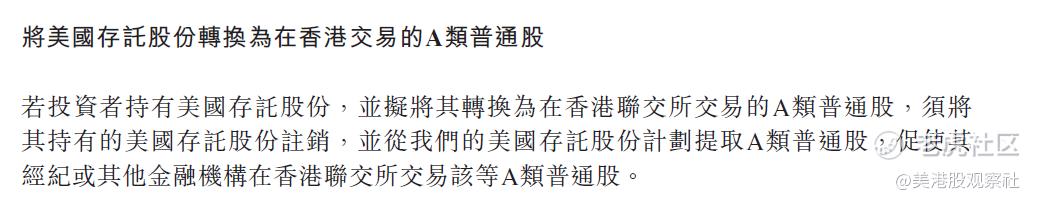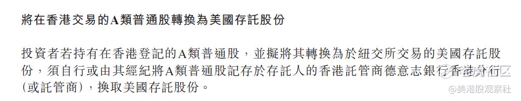 以香港上市文件中公布的转股流程为例,如果要将A类普通股转换成ADR,需要先通过经纪人向ADR托管人提交转移表格,在支付印花税、股份转移税以及存托人要求的费用后,存托人会向其发行ADR并交付给投资者指定的存管信托公司。转换比例就按照公司在美股上市时确定的ADR所代表的普通股数来计算