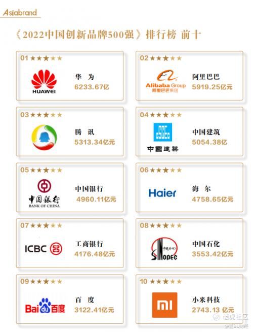 比如亚洲品牌研究院发布的2022中国创新品牌500强榜单中,排名第一的华为品牌价值为6233.67亿元,第二阿里巴巴为5919.25亿元,第三腾讯为5313.34亿元。有零有整,显得特别有信服力。榜单还指出,500强的总品牌价值为18.28万亿人民币,占2021年中国GDP的15.98%!