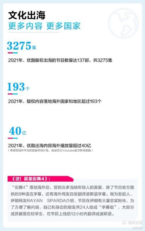 前几日优酷发布了《2021年暖报》,报告显示2021年优酷版权出海的节目数量达137部,版权内容落地海外国家和地区超过193个,出海内容海外播放量超过40亿(考虑到海外平台的数据可统计性,前述仅为Youtube官方账号数据)。