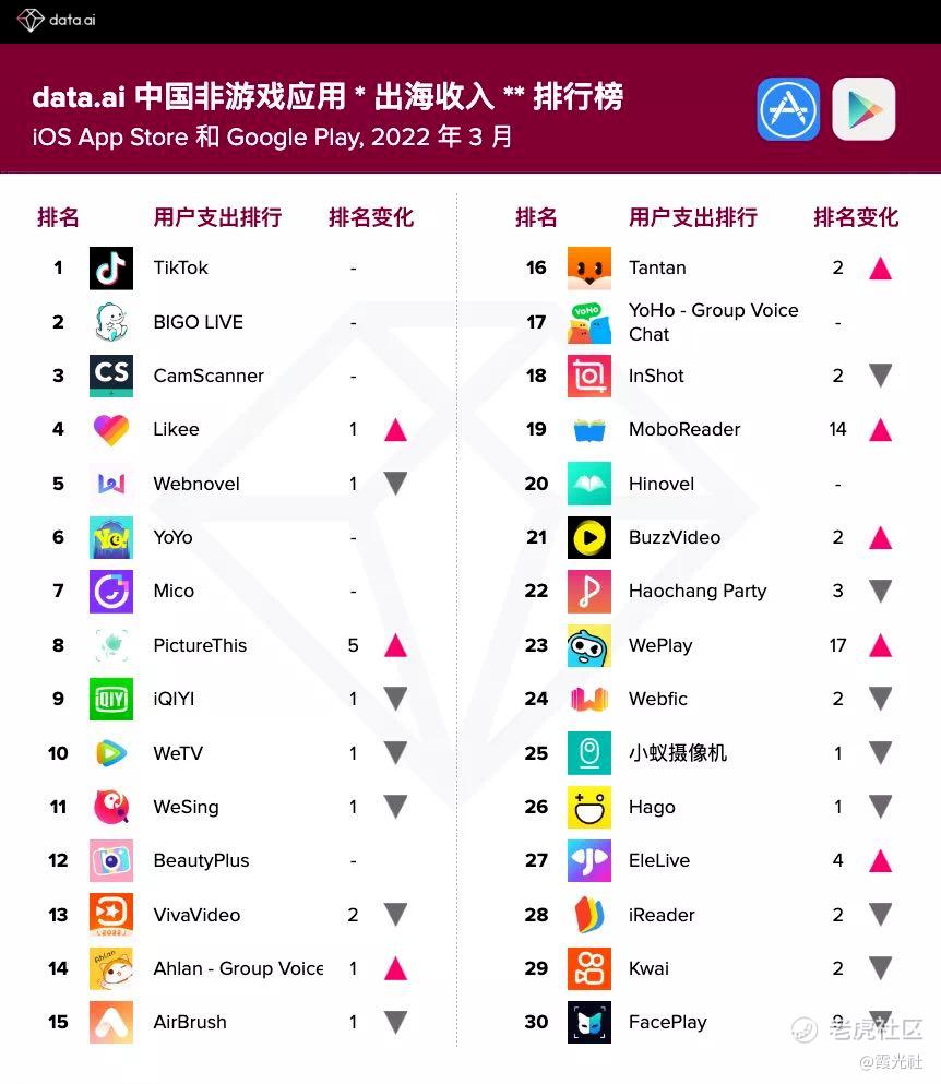 到了今年3月,data.ai发布的《中国非游戏厂商“出海收入排行榜》显示,爱奇艺国际版 iQIYI App和腾讯视频海外版WeTV分别占据榜单的第9和第10名。
