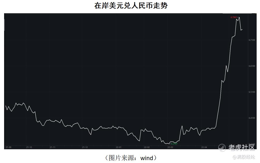 5月17日,美元兑人民币即期汇率大幅上涨,截至收盘报收6.7472,较上一交易日上涨超过495个基点,涨幅创2021年1月以来的最大值。人民币的反弹引发了市场关注,自4月下旬以来,美元指数的上涨进一步推动了人民币的贬值,美元兑人民币即期汇率从6.3778到5月13日盘中一度跌破6.81关口,贬值速度创下2010年以来的新纪录。