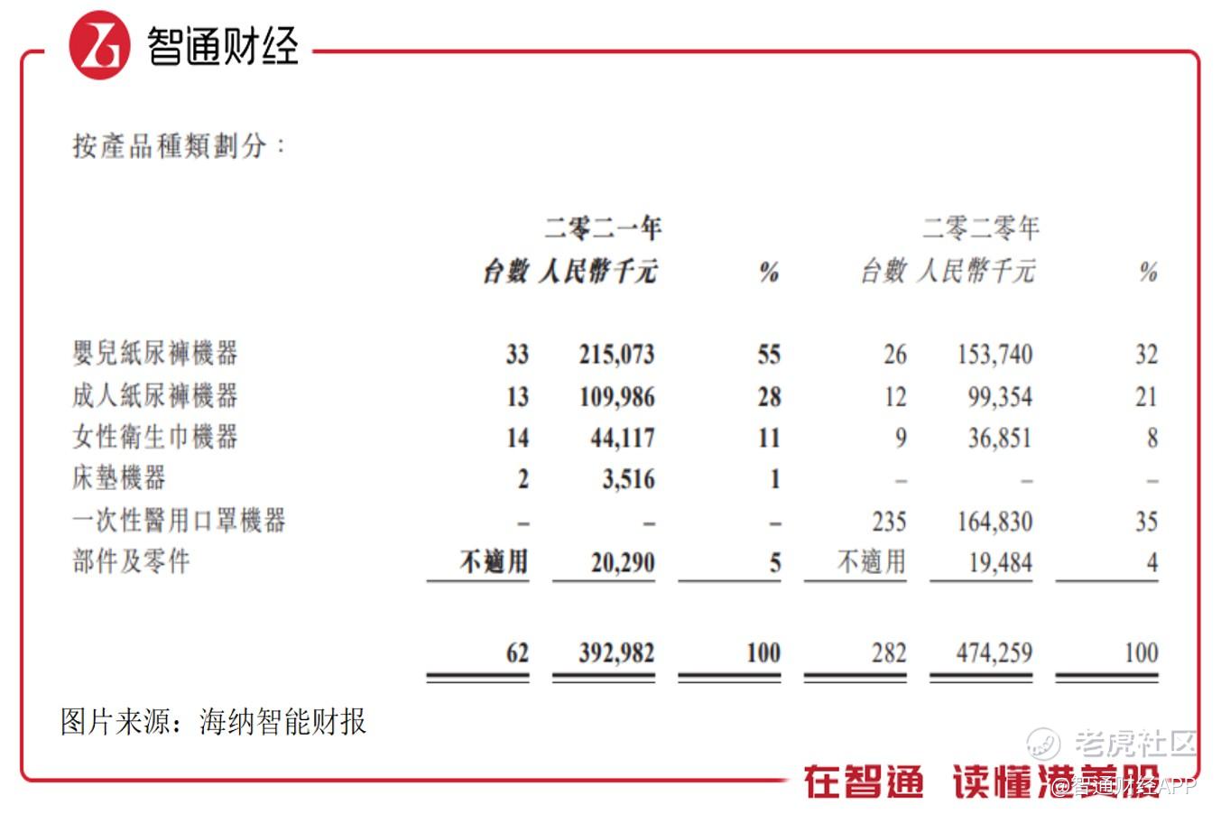 智通财经APP了解到,海纳智能是国内第三大一次性卫生用品机械设备制造商,主要产品包括婴儿纸尿裤机器、成人纸尿裤机器、女生卫生巾机器、皮垫机器及一次性医用口罩机器,其中皮垫机器2021年才有收入,医用口罩机器为2020年疫情时期产生收入,2021年未进行销售。