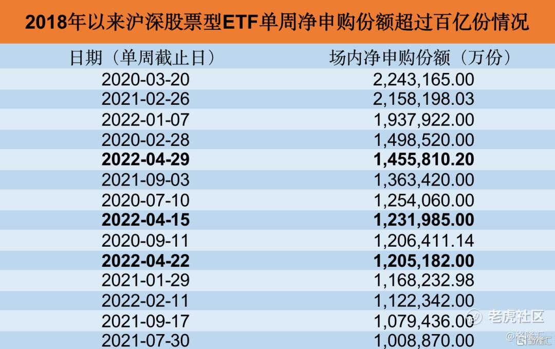 根据数据显示,4月11日-4月15日这一周,股票型ETF获净申购123.2亿份;4月18日-4月22日,净申购份额同样超过百亿份,为120.52亿份;4月25日-4月29日,更多抄底资金涌入,股票型ETF获净申购145.58亿份。