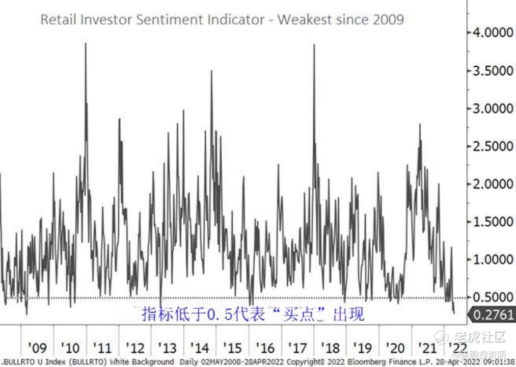 我们美股投资网密切关注的短期时机指标之一是投资者情绪。本周的情绪数据刚刚出炉,这是自2009年全球金融危机以来最疲弱的数据,这让我们感到不安。图中我们看到,指标跌至0.27,低于0.5代表买入信号,上一次低于0.5是2020年新冠出现后的美国进入封锁状态。