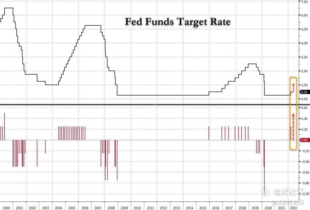 美联储周三宣布将基准利率上调50个基点至0.75%-1.00%区间,为2000年以来首次大幅加息50个基点,符合了市场预期。并公布6月启动缩表,最初每月最多缩减475亿美元、三个月后上限翻倍至每月950亿美元。 该缩表速度几乎是2017年,上轮量化紧缩时的近两倍。$纳斯达克(.IXIC)$