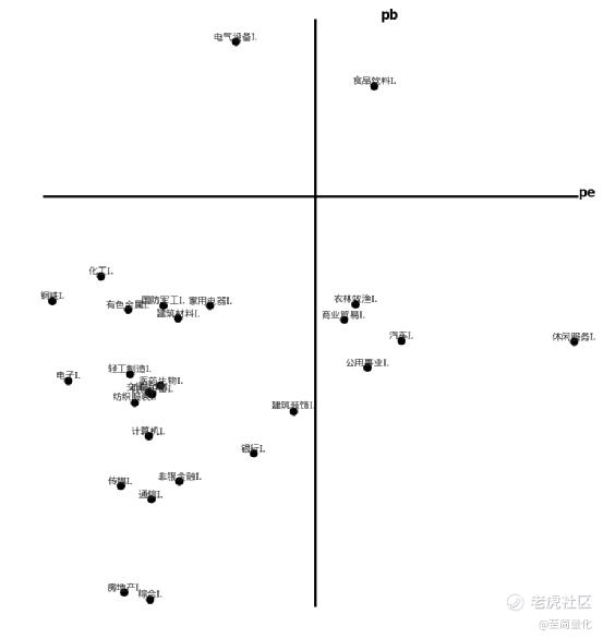 各一级行业的PB和PE偏离历史均值的情况,横线为PB历史估值中位数水平,越往上代表PB超出历史中位数越多,越往下代表PB低于历史中位数越多;竖线代表PE历史估值中位数水平,越往右代表PE超出历史中位数越多,越往左代表PE低于历史中位数越多。理论上第一象限的行业估值偏高,第三象限的行业估值偏低。