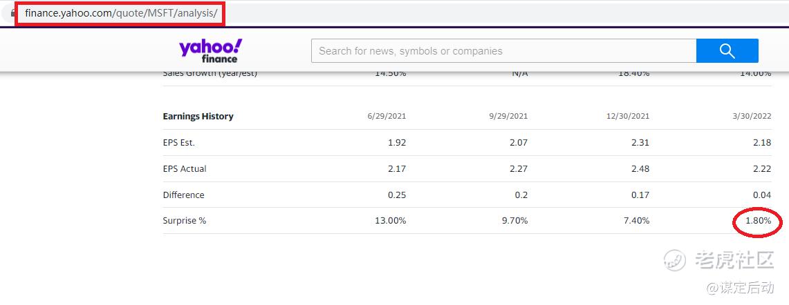 从数据看,微软秉承了一直以来稳健的作风,给出了一份让投资者满意的答卷。更重要的是给出了下个季度靓丽的前瞻,这为下面一个季度的微软股价提供强有力的支撑。如下图,可以在Yahoo Finance上搜索到这个季度微软每股盈利击败分析师预期的1.8%。