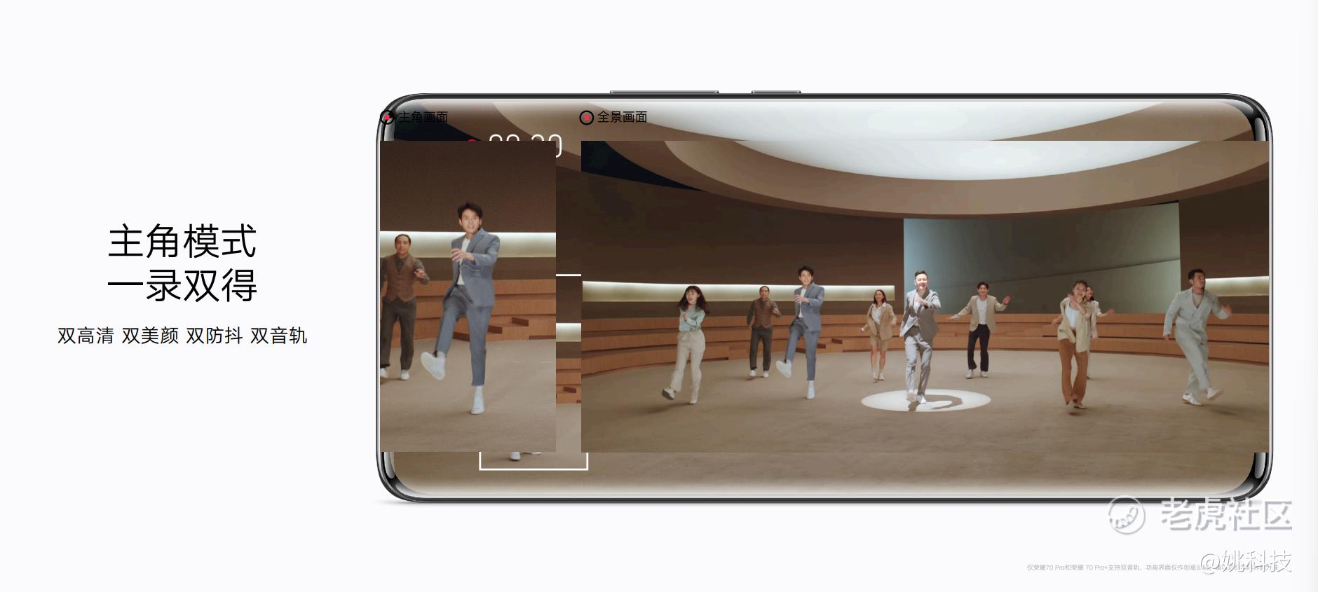 继荣耀50/60带来多镜录像、隔空换镜等创新功能后,荣耀又通过对消费者的深度洞察发现了Vlog拍摄的痛点:一次拍摄无法同时记录整体气氛和自己关注的焦点人物,即整体环境和个人特写无法兼得。此次荣耀70系列的“Vlog主角模式”:一次拍摄即可同时生成两支独立的高清视频,一支视频为记录全景画面的视频,另一支视频为可以智能追焦主角、跟拍主角的主角画面。荣耀数字系列持续以技术创新助力年轻用户自由自信表达,“主角模式”为用户带来“智慧追焦,双景兼得”的创新Vlog拍摄体验,全景的美好与主角的精彩同时捕捉,不留遗憾。