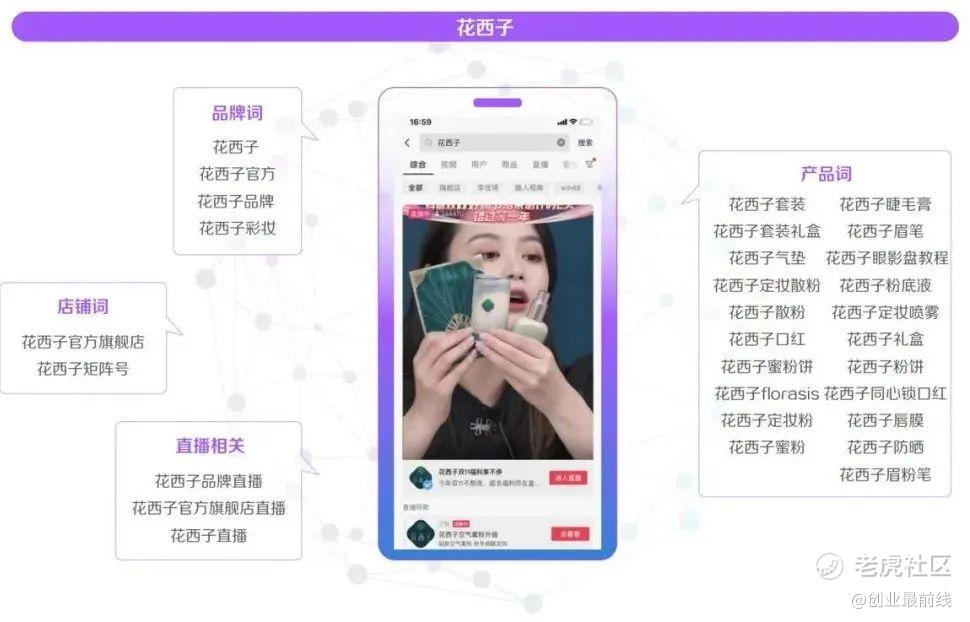 花西子就通过搜索品专的方式,承接住了用户被种草视频激发出的搜索兴趣。而且在流量获取时,还借助巨量引擎丰富的拓词工具,以更精准的搜索关键词覆盖了品牌、多样化的产品线、店铺及直播等多种场景信息触点,让用户一搜即可进入置顶在搜索页面中的直播品专,获取到了更多的高意向流量。在这种打法加持下,去年双11期间花西子GMV大幅增长,直播品专CTR高出大盘8%。