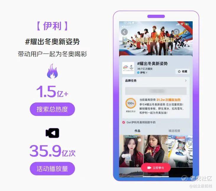 在冬奥会期间,伊利用#耀出冬奥新姿势为话题发起全民任务,激发用户们参与了魔性单板、野生滑冰、拉风雪车等各种挑战。同时进行了“抖音热榜+热点品专”的搜索广告资源组合投放,成功拉来亿万网友一起为冬奥和中国队喝彩。