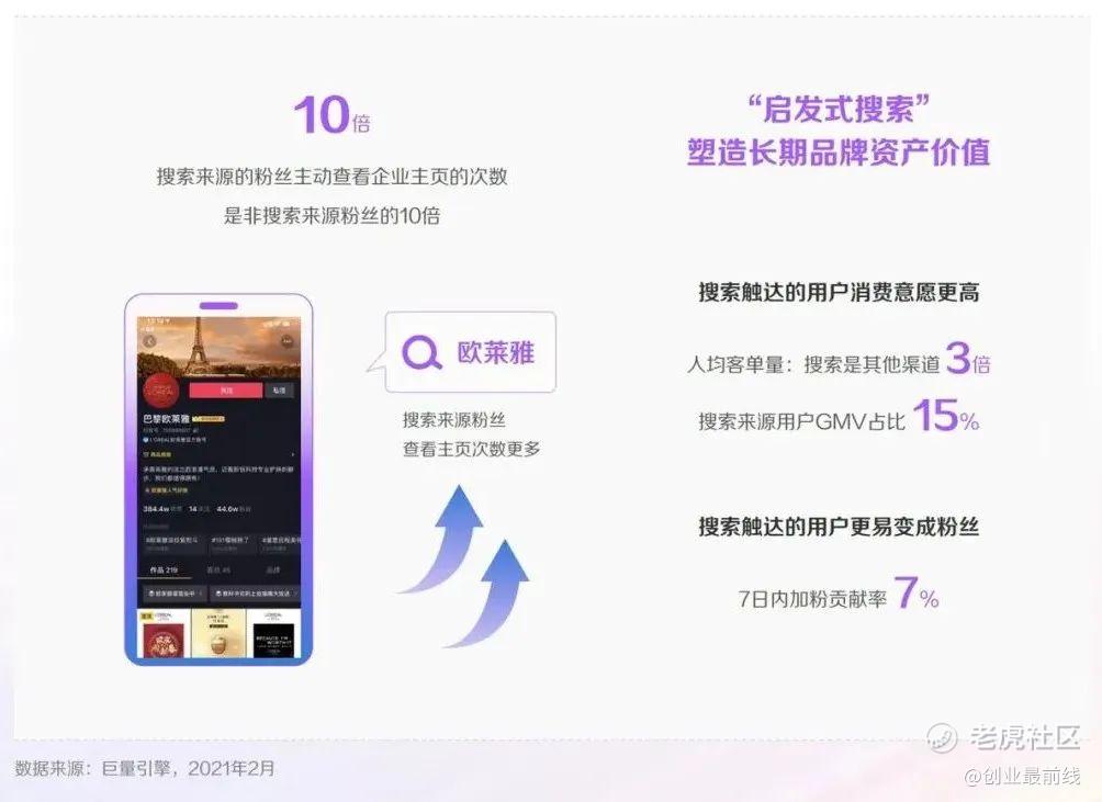 首先大家都能看见,启发式搜索的表面价值是大家好奇点、兴趣的收口。当被吸引的用户想通过搜索了解更详细内容时,可以直接通过搜索品专、搜索竞价广告引导至抖音企业号这样的企业私域阵地,甚至直接通过搜索品专进入品牌旗舰店、直播间等完成下单购买,提升企业的营销转化效果。