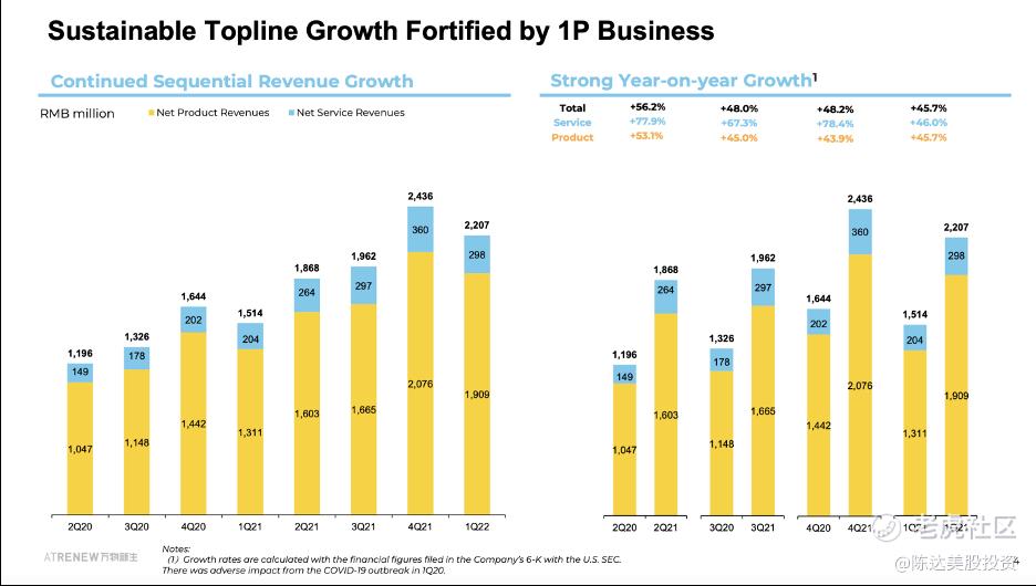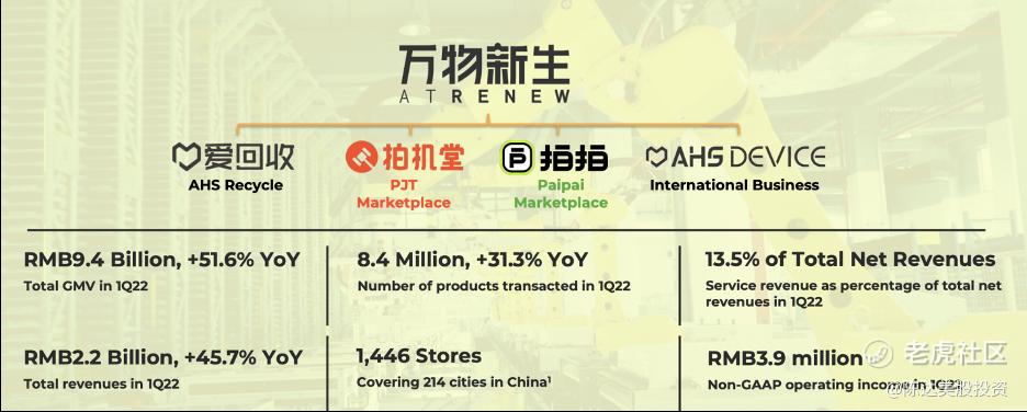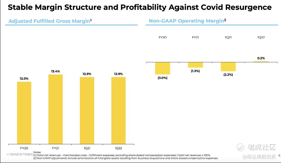 而万物新生的Q1的财报也能印证以上行业alpha的存在,在总体消费放缓的情况下,Q1万物新生能逆势保持高速增长。GMV 同比增长 51.6%到 93.8 亿,收入同比增长45.7%到 22.1 亿。公司盈利,non-GAAP 的运营利润390万。另外财务上比较好的苗头,从现金流来看,经营性活动的现金流转正为1.2 亿。