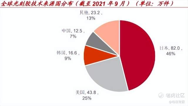 从专利数看,日本美国合计占比超 70%,大陆发展迅速。根据智慧芽 数据,截至2021年9月,全球光刻胶第一大技术来源国为日本,专利 申请量占全球光刻胶专利总申请量的46%;美国则以25%的申请量位列第二。中国则以7%的申请量排在韩国之后。