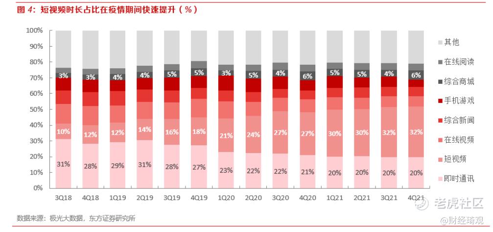 根据极光大数据,从4Q19到4Q21短视频的时长占比由17.8%提升至32.3%,而其他行业的APP时长占比基本都在下降。