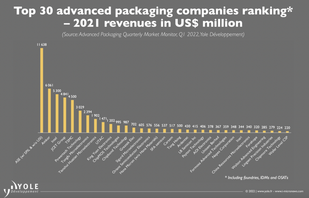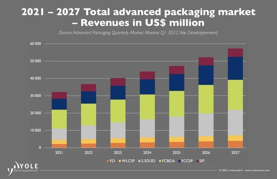 2021年对于先进封装行业来说是丰收一年,现在包括5G、汽车信息娱乐/ADAS、人工智能、数据中心和可穿戴应用在内的大趋势继续迫使芯片向先进封装发展。2021年先进封装市场总收入为321亿美元,预计到2027年达到572亿美元,复合年增长率为10%。然而在先进封装这个市场中,中国封装企业不仅占据了主要的地位,还在去年迎来了强势增长。