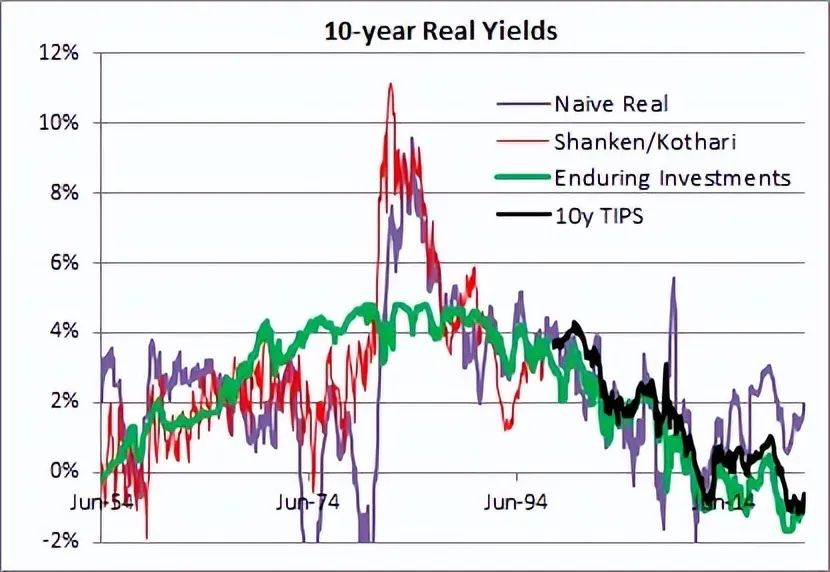 这不仅适用于椰子经济,尽管我认为这并不是一种交易模式,只是一种具有悠久历史的自然趋势。 下图中,紫色线是用10年期国债名义收益率减去过去1年通胀率得到的实际10年期收益率,长期平均为2.34%; 红色线是由Shanken & Kothari的研究论文得出的真实产量序列,长期平均为3.13%; 绿色线是持久投资实际收益,长期平均为2.34%;黑色线为10年期TIPS,长期平均为1.39%。