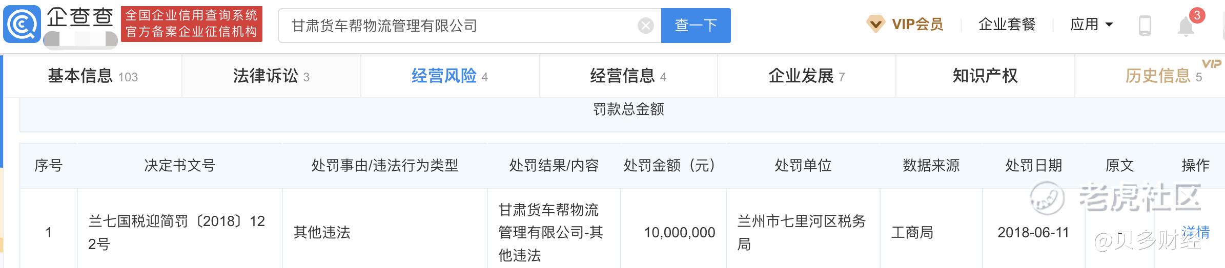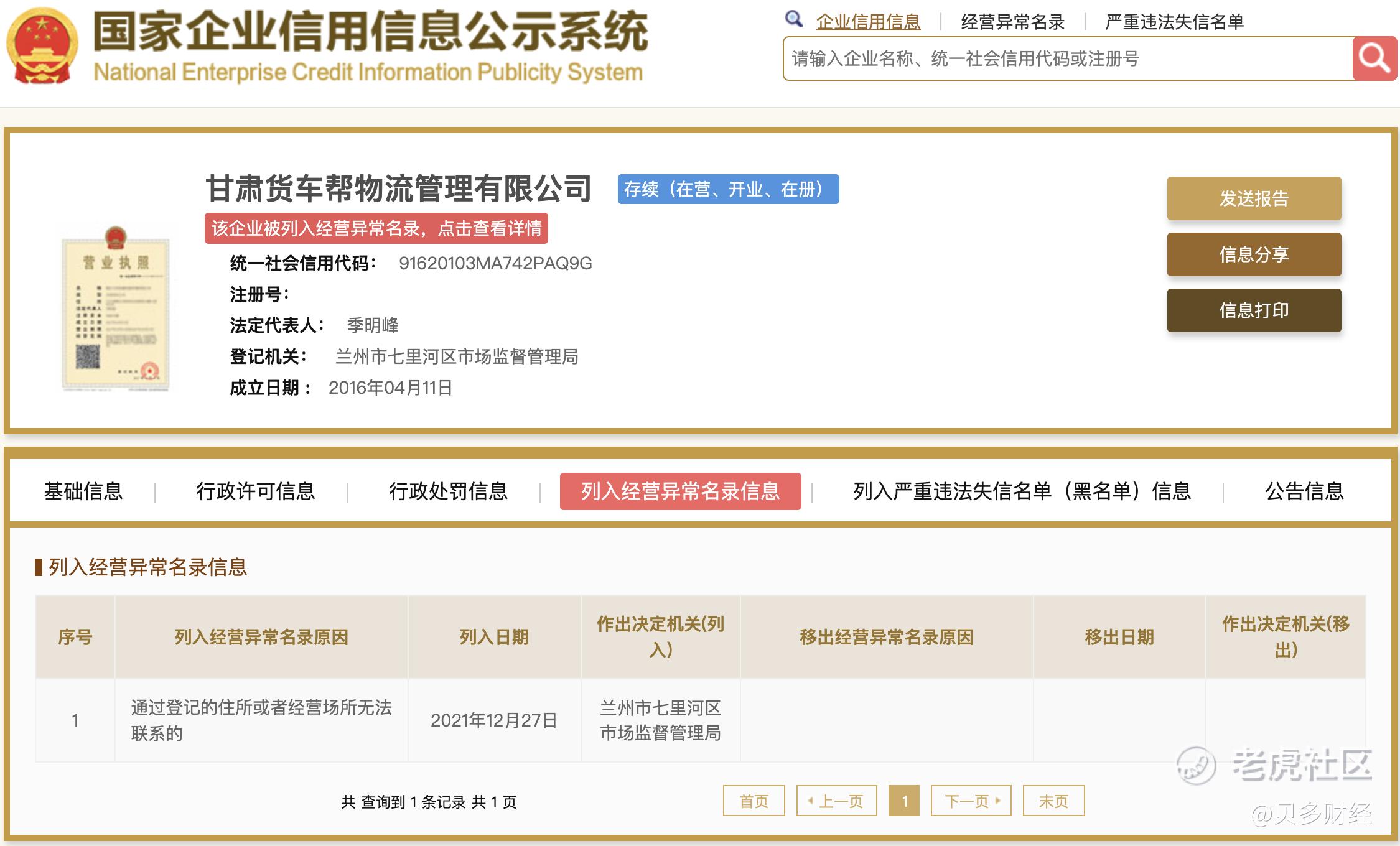 除了北京货车帮科技有限公司外,货车帮旗下甘肃货车帮物流管理有限公司,以及其持股16%的贵州集成物流大数据科技有限公司均已被列入经营异常名录,至今尚未移出。其中,甘肃货车帮物流管理有限公司还曾在2018年被兰州市七里河区税务局罚款1000万元。