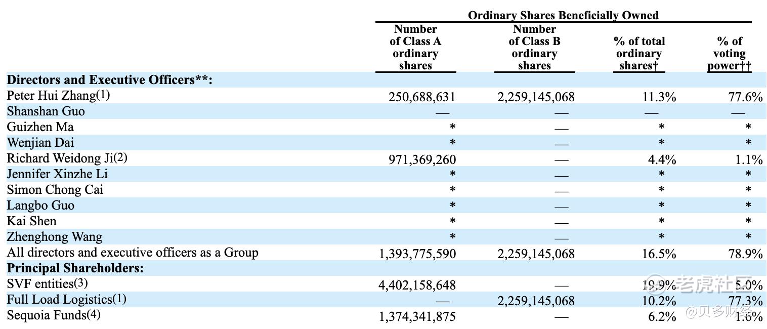 前不久,满帮集团公布的2021年年报(20-F文件)显示,截至2022年3月31日,张晖持股11.3%,有77.6%的投票权;满帮集团董事季卫东持股4.4%,原货车帮创始人、满帮集团创始人兼董事戴文建持股比例不足1%。