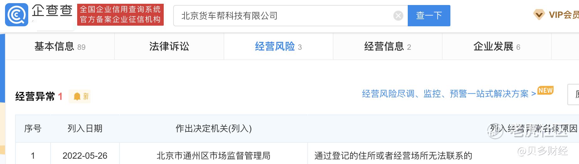 近日,满帮集团旗下公司又一家陷入危局。贝多财经了解到,2022年5月26日,北京货车帮科技有限公司因通过登记的住所或者经营场所无法联系,被北京市通州区市场监督管理局列为经营异常。