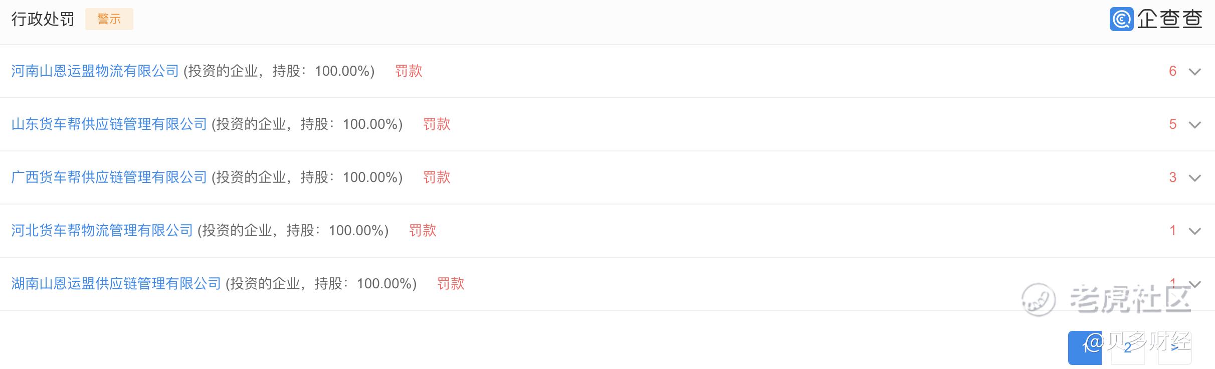 事实上,河南山恩运盟物流有限公司、山东货车帮供应链管理有限公司、广西货车帮供应链管理有限公司、河北货车帮物流管理有限公司、湖南山恩运盟供应链管理有限公司和陕西山恩运盟物流有限公司等均有被处罚记录。