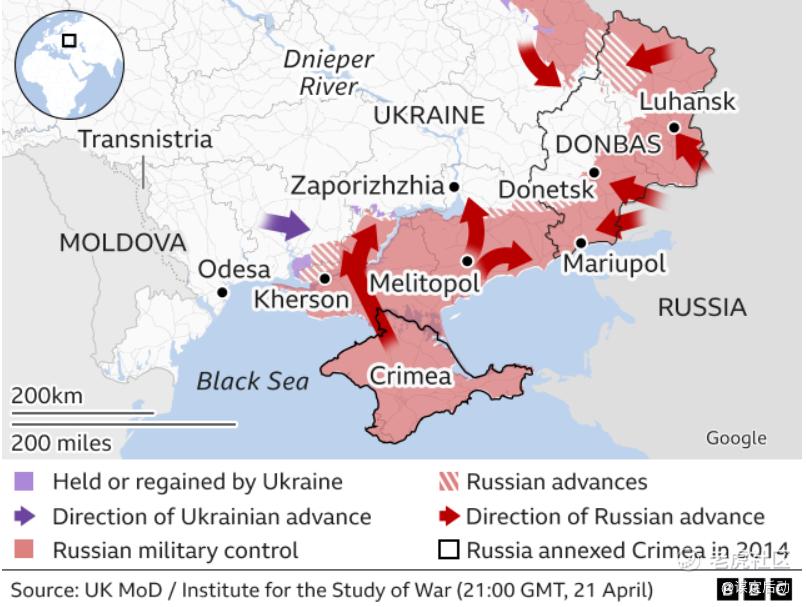 从战报上看俄乌两军互有攻守,俄军在东部南部两大战场都发动进攻,但是进展甚微,乌军防守绰绰有余但是因为缺乏重武器而难以攻坚。因此两军现阶段处于拉锯战状态。下图是俄乌两军在东部南部战场的形态示意图。