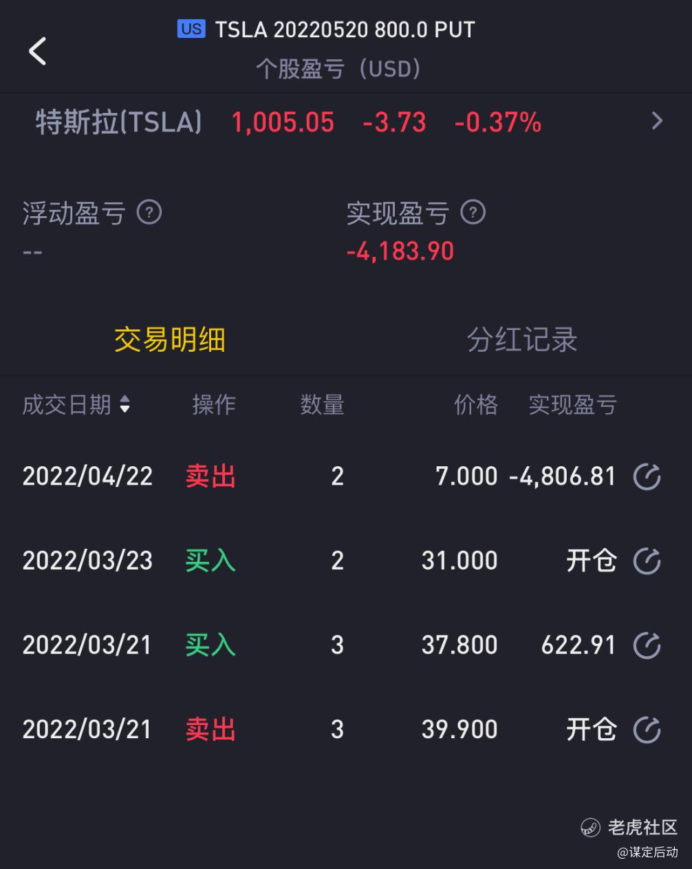随着特斯拉亮瞎眼财报的发布,股价再次上冲到1000,这张2手行权价800行权日为5月20日的保护显得不必要了。虽然是亏损了4000多刀,但是我是以买保险的心态对待的,这一个月来特斯拉的股价虽然起起伏伏,我的心态是很平和的,因为我有保护在手。现在这个保单已经不需要了,那么我就平仓了结,能收回多少算多少吧
