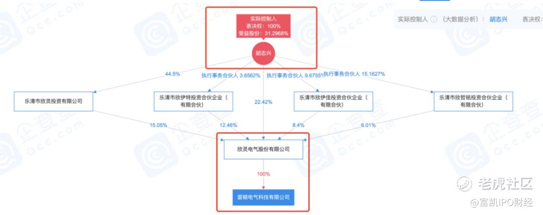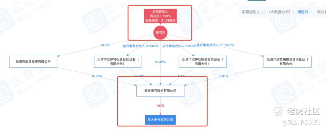欣灵电气股份有限公司(以下简称“欣灵电气”)主要从事低压电器产品的研发、生产和销售。欣灵电气招股书(上会稿)显示,发行人董事长胡志兴、副董事长胡志林为兄弟关系;董事瞿博秀为胡志兴之妹、胡志林之姐胡小琴的儿子;董事会秘书胡伊特为胡志兴之子。截至本招股说明书签署日,胡志兴、胡志林分别持有公司 1,722.50 万股、1,722.50 万股股份,占比分别为 22.42%、22.42%,合计占比 44.84%,胡志兴、胡志林共同控制公司,为发行人控股股东。胡志兴、胡志林分别直接持有发行人 22.42%、22.42%的股份;通过欣灵投资间接控制发行人 15.05%的股份;胡志兴为欣伊特投资、欣伊佳投资、欣哲铭投资的执行事务合伙人,通过欣伊特投资、欣伊佳投资、欣哲铭投资分别间接控制发行人 12.46%、8.40%、6.01%的股份。胡志兴、胡志林合计控制发行人 86.75%的股份,为发行人实际控制人。