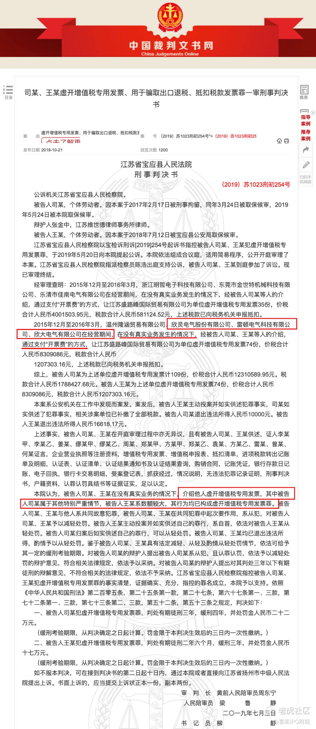 案号(2019)苏1023刑初254号显示的雷顿电气科技有限公司实控人为欣灵电气胡志兴。