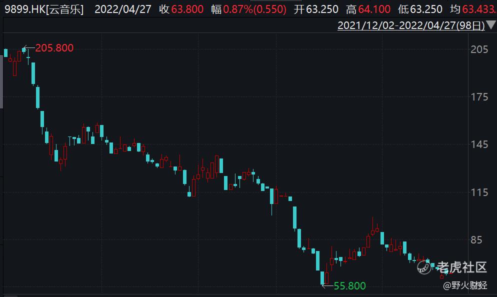 另外,云音乐2021年12月上市,发行价为205港元,截至4月27日收市股价为63.8港元,破发大约有七成。