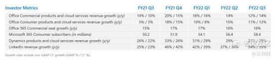 从连续5个季度的数据来看,office的商业收入环比前几个确实有放缓,在后疫情时代,20/21年的高基数给公司带来一定的压力,但是总体保持的增速还不错,而个人版office的增速依然保持稳健增长,office 365连续五个季度保持15%以上的增速,并未出现明显的放缓,订阅人数为5840万,继续保持较高增速,环比上个季度增长200万用户,领英连续五个季度收入增速都还不错。