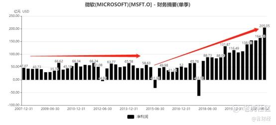 而从微软的单季度业绩趋势来看,2013年以前,微软的营收与净利润都是处在一个较平稳的状态中,增长不明显,而从2013年以来,公司不管是营收还是净利润都出现了新一轮的加速,而这一轮加速的背后,就是云计算时代,微软的“云优先”战略取得了巨大的成就。