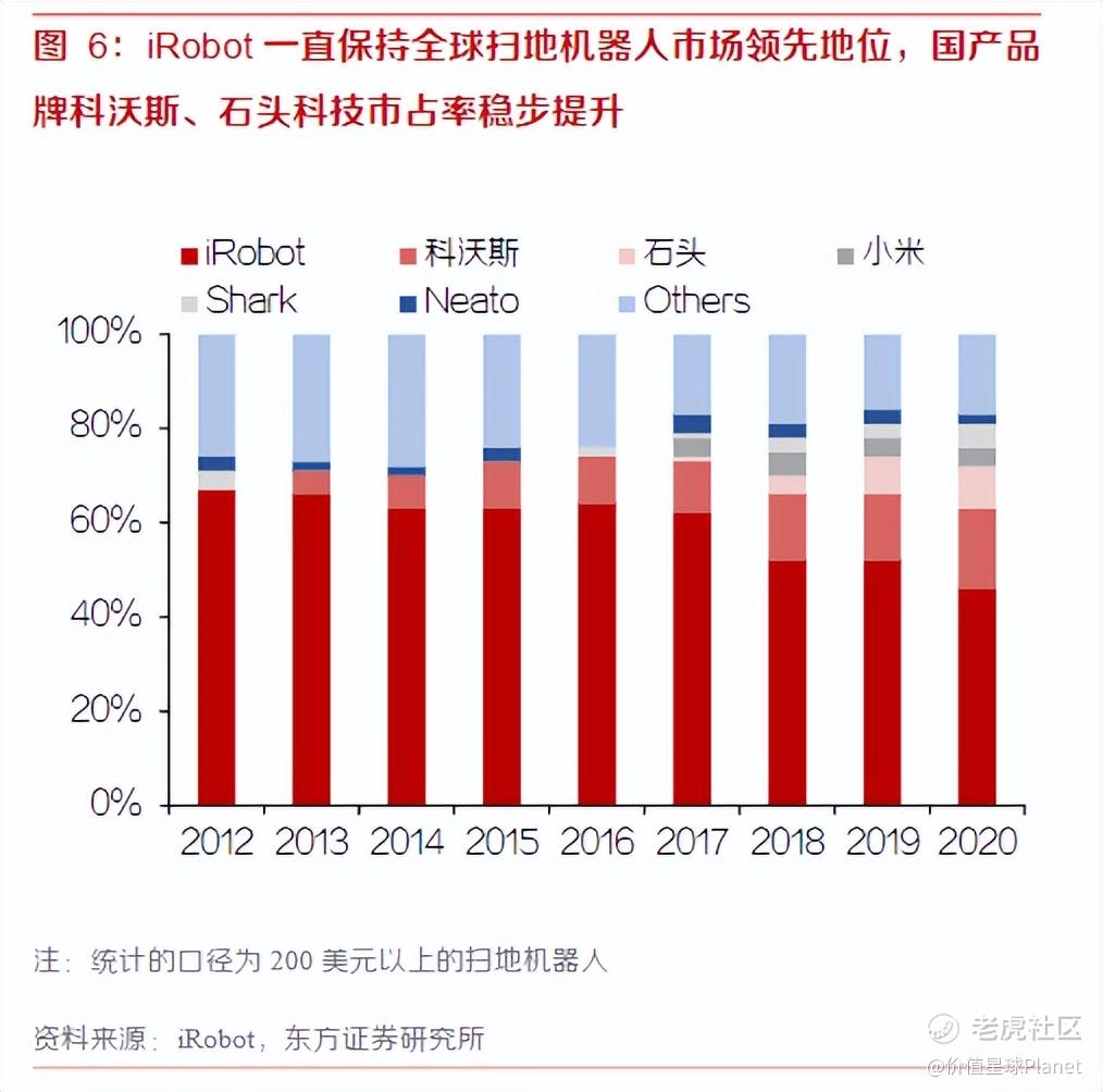 东方证券数据显示,美国机器人公司iRobot仍然是全球扫地机器人龙头,2020年全球市占率达46%;后来者如科沃斯、石头科技等公司正迎头赶上,2020年科沃斯、石头科技全球市占率分别为17%、9%,位列世界第二与第三。而安克创新旗下Eufy仅能和其他众多品牌共同挤占20%左右的市场份额。