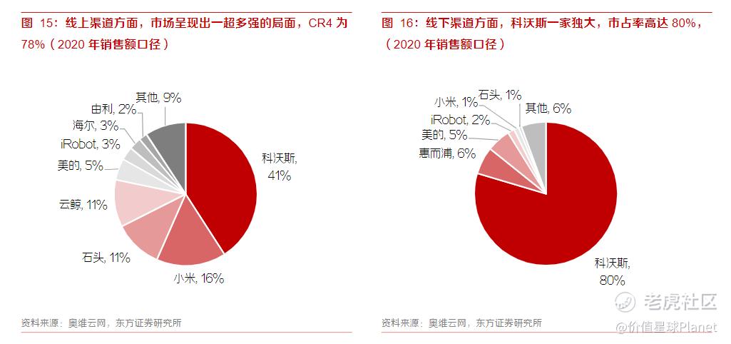 而在安克创新的另一王牌产品扫地机器人上,竞争压力更大。2020年数据,线上渠道方面,科沃斯独占41%的市场份额,小米、石头、云鲸、美的等紧随其后;在线下,科沃斯依然遥遥领先,占据80%的市场,惠而浦、美的、iRobot也名利前茅。