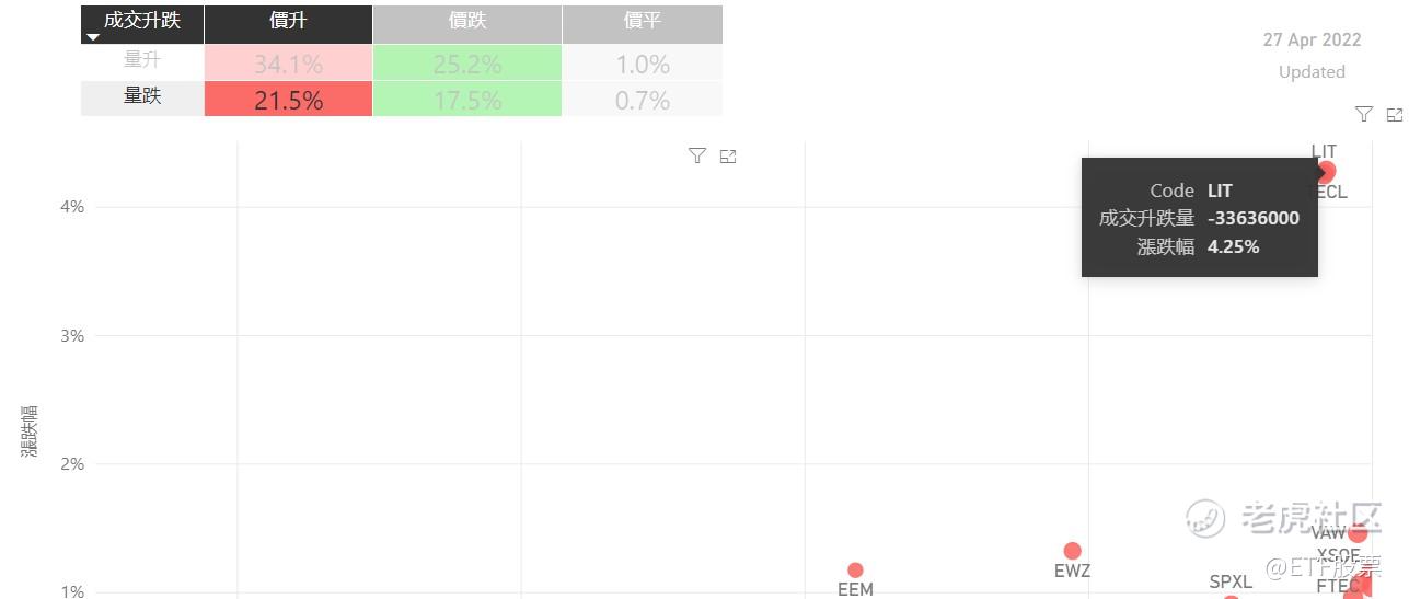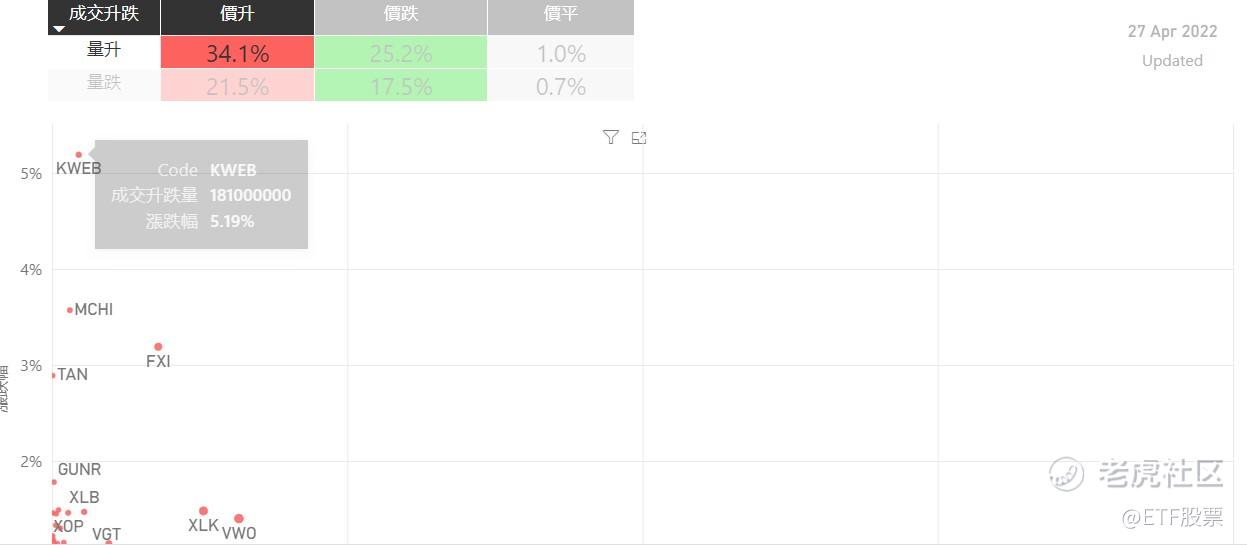 在4月27日的美股主要300只ETF交易品种中,有56%的ETF交易品种的ETF价格上升;尽管有过半数ETF价格录得上升,不过仍有22%的ETF产品,虽然价格上升,成交额却下跌。
