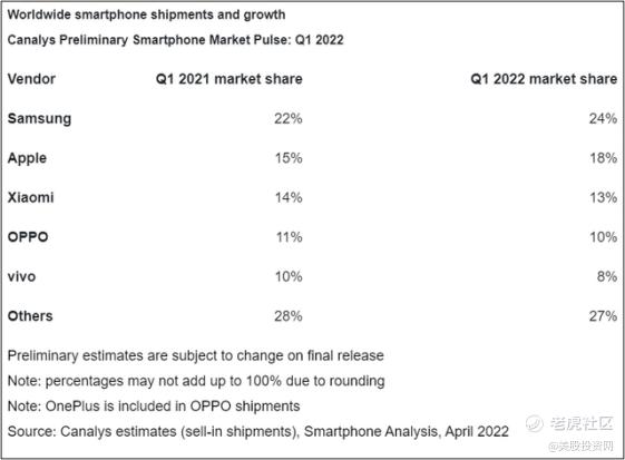 三星在2022 年第一季度以 24% 的市场份额成功超越苹果排在第一位置;苹果市场份额为18%。我们可以看到苹果的业绩非常稳健。