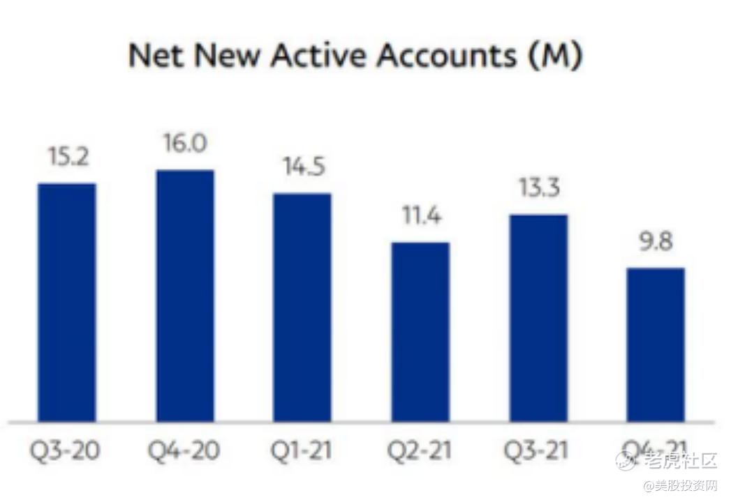 截至2021年底,PayPal拥有4.26亿活跃用户和商户账户。但是这家在线支付公司净新增活跃账户的上升趋势尤其令人担忧。在疫情期间,净新增活跃账户数量在第二季度达到2130万的峰值,但在过去四个季度中的三个季度,净新增活跃账户的增长已经放缓。2021年第四季度新增980万个新账户,为疫情开始以来的最低水平。
