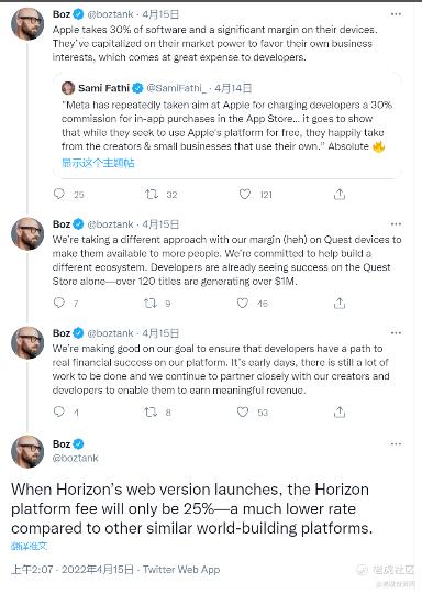 虽然此消息一出,引来了苹果的吐槽。苹果发言人表示,Facebook一面吐槽苹果税过高,一面又在自己的平台抽取高比例佣金,充分显示了这家公司的虚伪。而Facebook VR/AR 技术主管、首席技术官 Andrew Bosworth认为,Web 版的佣金费率为 25%,远低于其他同类虚拟世界平台。而 VR 版佣金费率 47.5%,相比 Roblox,Facebook 已经“仁慈”了很多。如此高的佣金比例未来可能使Roblox丧失竞争力。